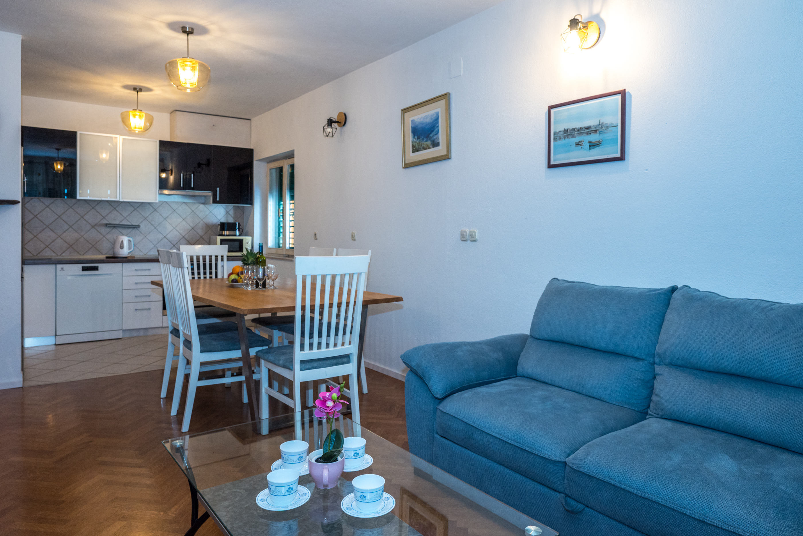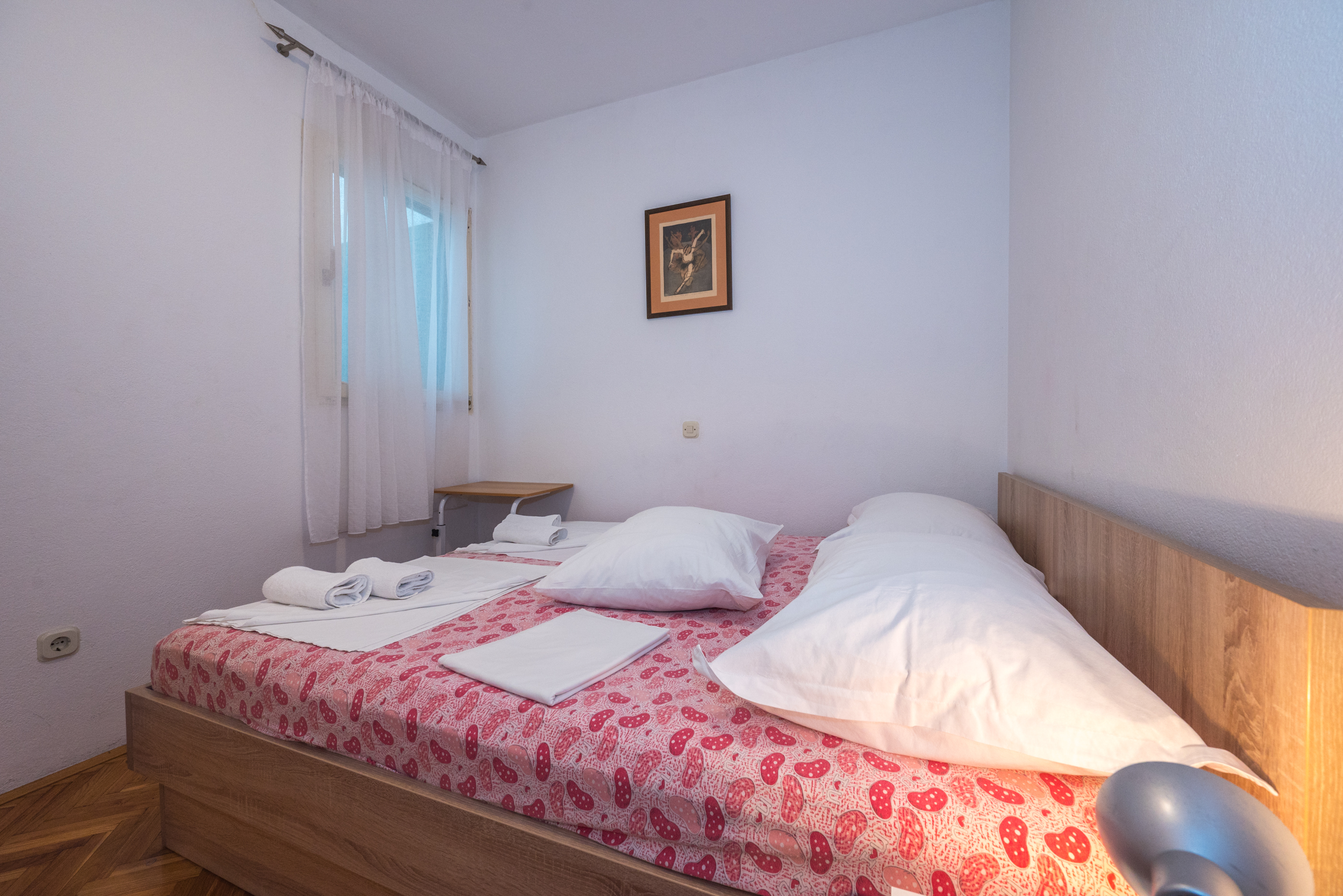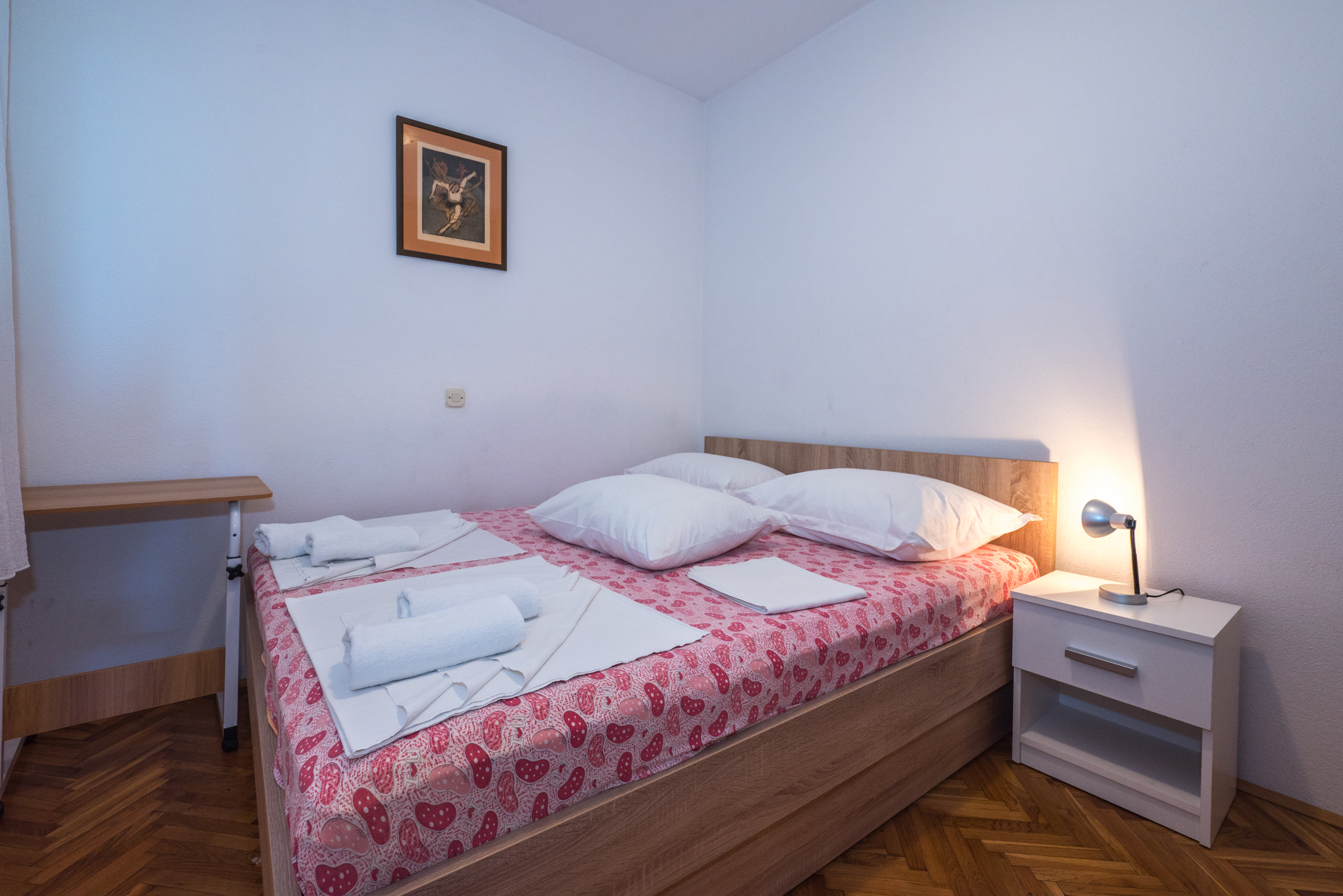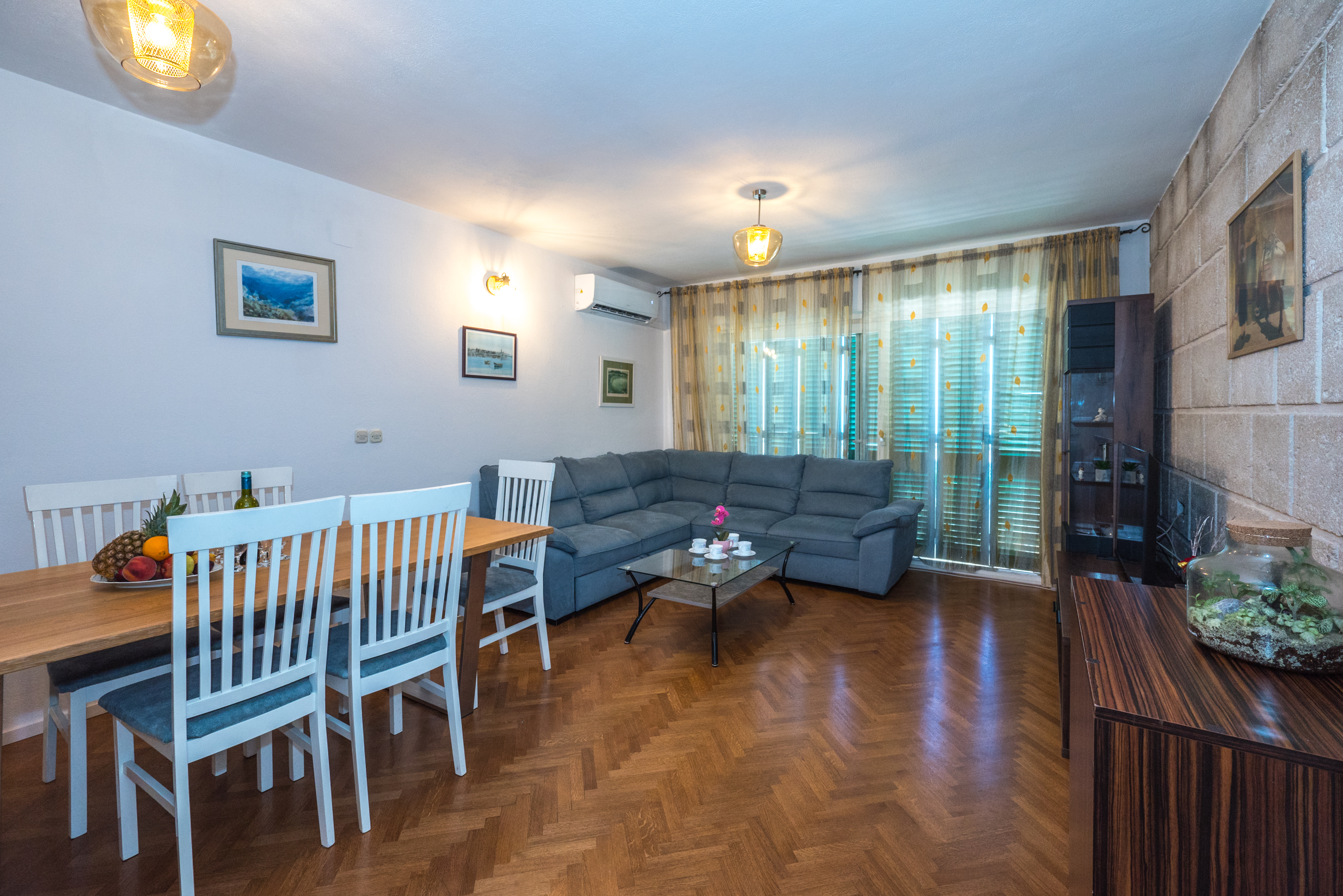 Apartman 2 Apartman 2 je apartman tipa “2+2+2” koji se sastoji od dvije dvoležajne spavaće sobe, dvije kupaonice, kuhinje s blagovaonicom, dnevnog boravka te terase. Apartman je klimatiziran i u njemu se nalazi TV. 1 2 ►